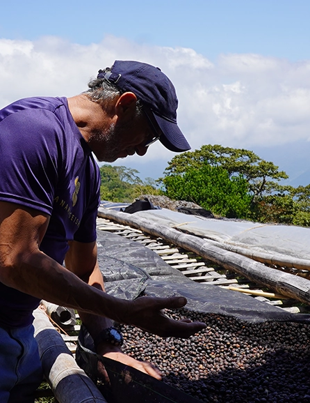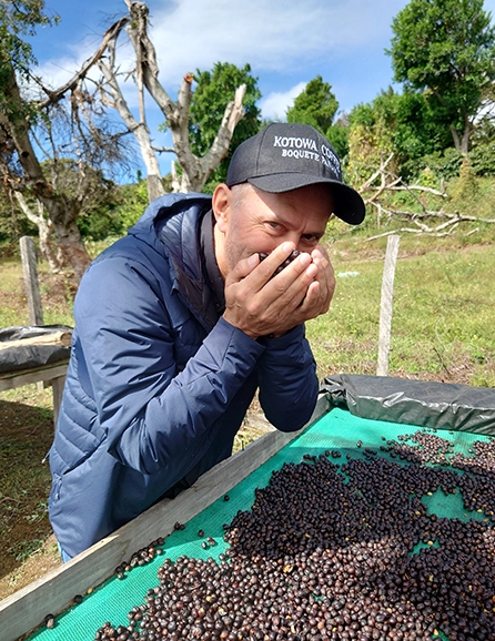 アルティエリは、所有する2農園の全区画に孫の名前を付け、コーヒーを家族のように大切に育てており、卓越した精製技術により唯一無二の味わいを作り出しています。本ロットは、チョンビ区画で収穫したコーヒーチェリーを袋に入れて冷たい川に3日間浸しながら発酵を行う、RFF(リバーフローファーメンテーション)を今年初めて挑戦しています。その後、温度と湿度が管理された部屋でじっくりと乾燥をさせています。